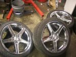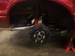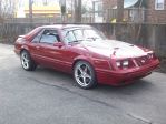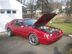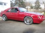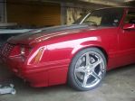 finally got the brakes done. sn95 spindle swap, new struts, take off rotors,calipers, brackets and lines from a 03 cobra. New 03 ball joints. Replaced the rear drum shoes and hardware. I will be converting to disc when I have the money. I also have new rolling stock, new chrome 18" saleens. 235/40/18 front, 265/35/18 rear. More pics of the car on the ground soon, taking care of a ps leak tomorrow.