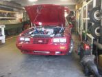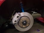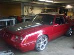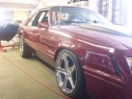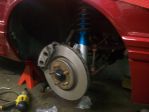 finally got the brakes done. sn95 spindle swap, new struts, take off rotors,calipers, brackets and lines from a 03 cobra. New 03 ball joints. Replaced the rear drum shoes and hardware. I will be converting to disc when I have the money. I also have new rolling stock, new chrome 18" saleens. 235/40/18 front, 265/35/18 rear. More pics of the car on the ground soon, taking care of a ps leak tomorrow.